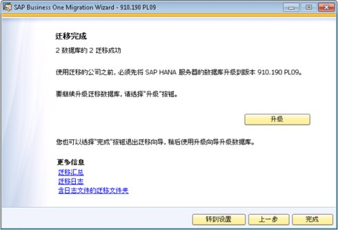 這里會(huì)顯示遷移完成的結(jié)果(成功或失敗)。在遷移完成后,如果您想繼續(xù)對(duì)遷移后的SAP HANA數(shù)據(jù)庫進(jìn)行升級(jí),可以點(diǎn)擊'升級(jí)'按鈕,則會(huì)繼續(xù)進(jìn)入升級(jí)向?qū)АD部梢赃x擇'完成'按鈕以退出遷移向?qū)АM瑫r(shí)您也可以點(diǎn)擊'更多信息'中的鏈接來很方便地訪問遷移的匯總及日志信息。