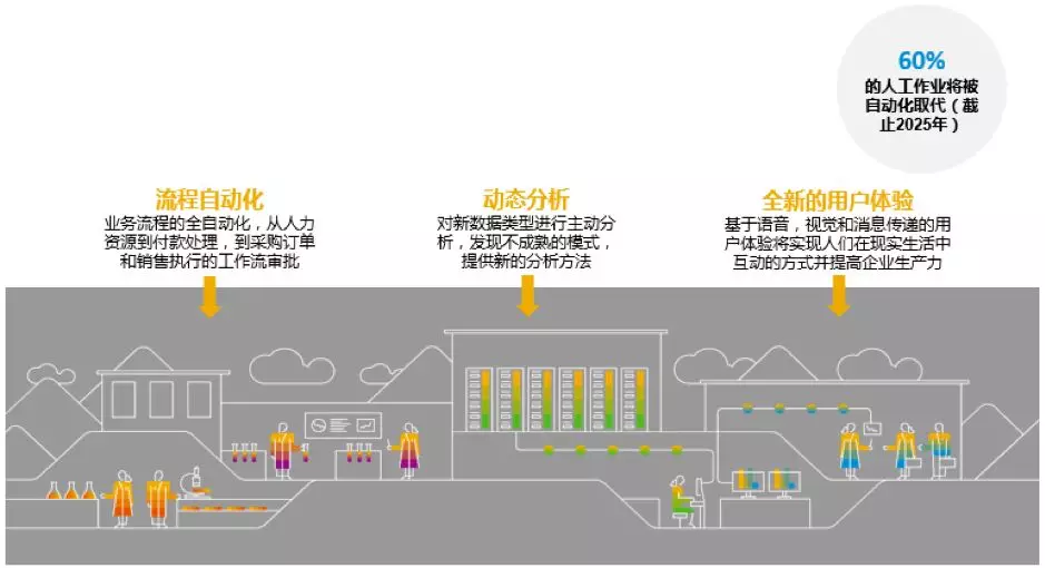 根據(jù)SAP公司及行業(yè)協(xié)會做的商業(yè)分析和預(yù)測,到2025年全球運(yùn)營的現(xiàn)代化商業(yè)中,將有60%的人工作業(yè)將被自動化所取代,這些領(lǐng)域包括且不限于,制造業(yè),銀行業(yè),保險業(yè),零售終端,倉儲配送等等?,F(xiàn)代企業(yè)主要對業(yè)務(wù)流程自動化,企業(yè)數(shù)據(jù)動態(tài)分析,以及新的用戶體驗有著極高的需求和期待。