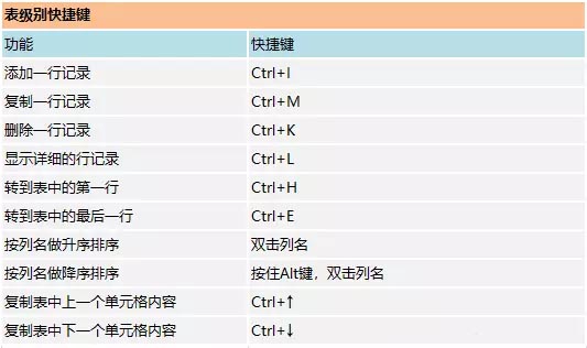 表級別快捷鍵
