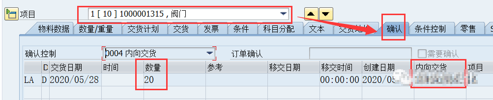 在采購訂單閥門物料項目細節區的確認卡片中可以看到剛才創建的內向交貨單,如下圖。